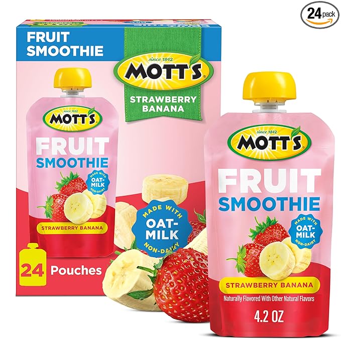 Mott’s Fruit Smoothies Strawberry Banana, 4.2 oz Clear Pouches, 24 Count (6 Packs of 4), Non-dairy, Made With Oatmilk, Made With Real Fruit, Good Source of Calcium, On-the-Go