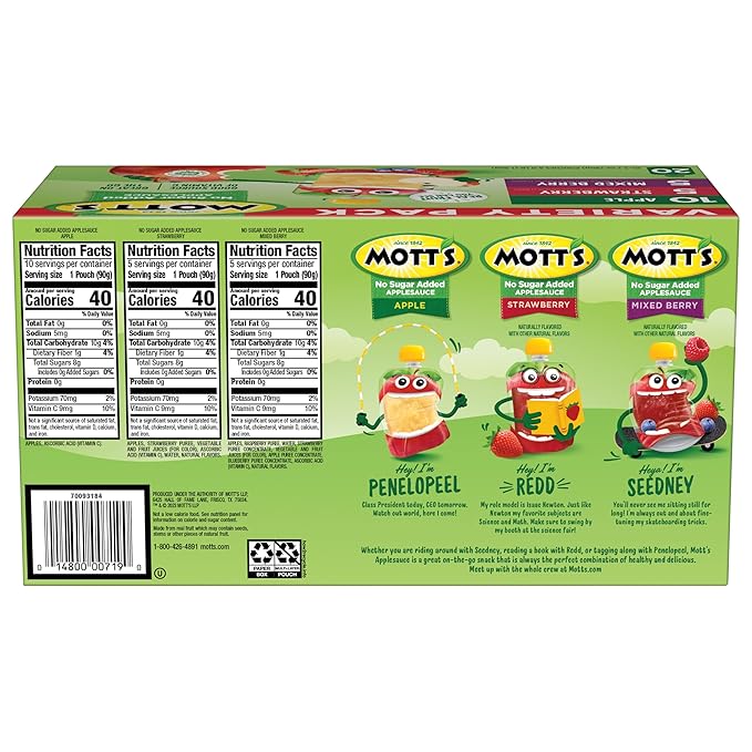 The original, delicious treat, Mott’s No Sugar Added Applesauce Variety Pack is the perfect snack or meal companion. Available in 12- or 20-packs, Mott’s Applesauce comes in refreshing flavors like our appetizing Apple, sweet Strawberry, and tart Mixed Berry so you’ll be sure to find something that satisfies your taste buds. Made with 100% real fruit and no artificial flavors, you can feel good about making healthy choices. A good source of Vitamin C and free of cholesterol, Mott’s No Sugar Added Applesauce Variety Pack brings the best of the orchard to your household to help families enjoy delicious fruit goodness every day. Mott’s has a strong heritage and has been the trusted apple juice and sauce brand since 1842. Dedicated to giving parents easy ways to help their families be their very best, Mott’s holds the apples to a very high standard. That’s why we pack lots of delicious fruit flavor from ripe apples into every serving. So, whether you’re home with your family or on the go and in need of a snack, Mott’s has a delicious flavor to enjoy. With an extensive suite of flavors, Mott’s No Sugar Added Applesauce Variety Pack gives you flavorful choices for all your snacking needs!